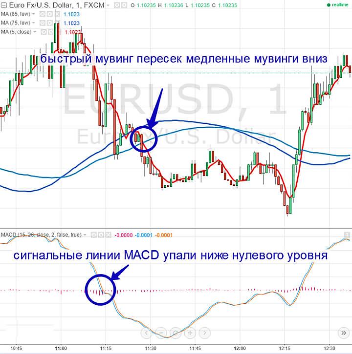 Линии Moving Average должны пересечься. Сигнальные линии MACD пересекут нулевой уровень в направлении снизу вверх. Появление таких показателей становится сигналом к переходу на страницу брокера для оформления сделки ВВЕРХ.