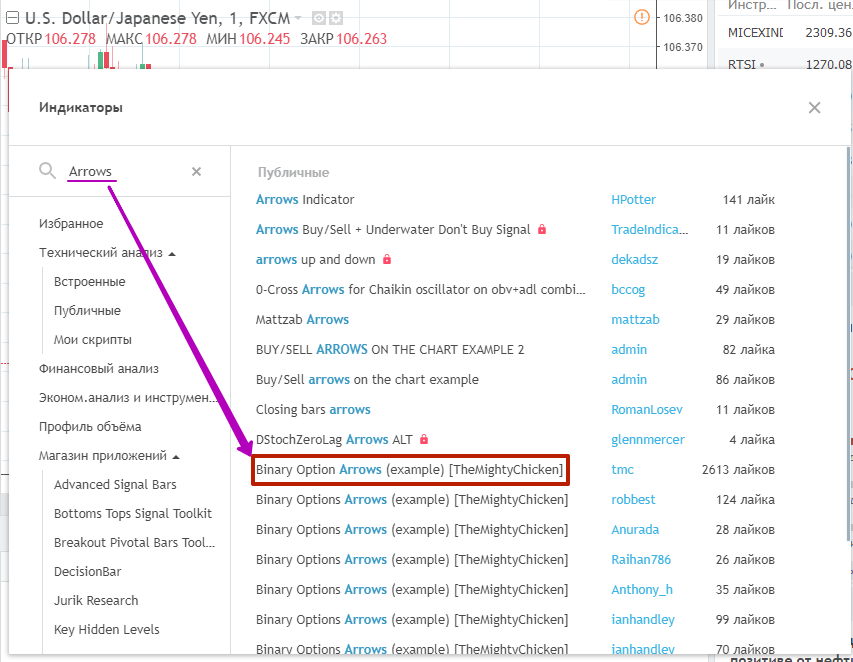 На живом графике https://new.tradingview.com/chart - Chart можно познакомиться с превосходным дисплеем Binary Option Arrows. Для этого в меню понадобится нажать кнопку индикаторов, после чего ввести в окошке поиска «Arrows».