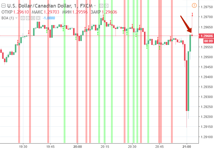 Красными и зелеными полосами на представленном графике обозначаются убыточные и прибыльные сделки. Лучше всего входить на рынок после того, как завершится череда красных полос.