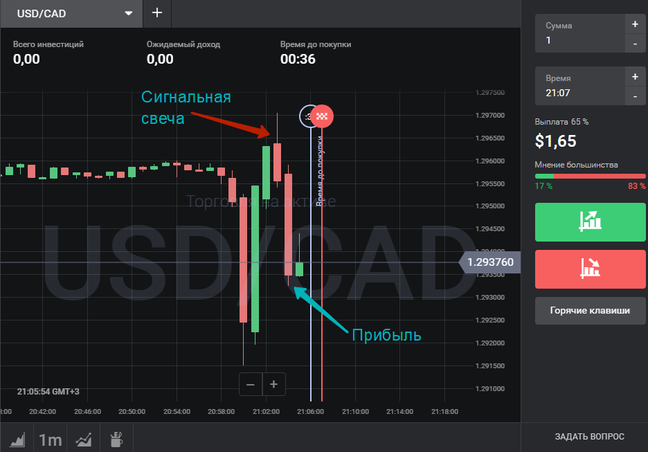 В поступлении сигнала о падении цены после того, как тренд был растущим, нет ничего особенного. Сделка на покупку опциона “Вниз” открывается сразу.