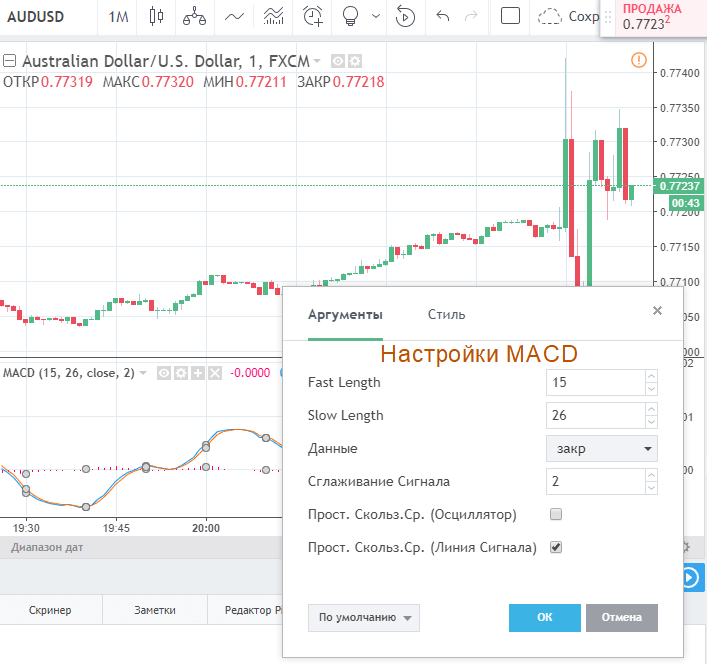 - MACD с настройками 15, 26, close, 2;