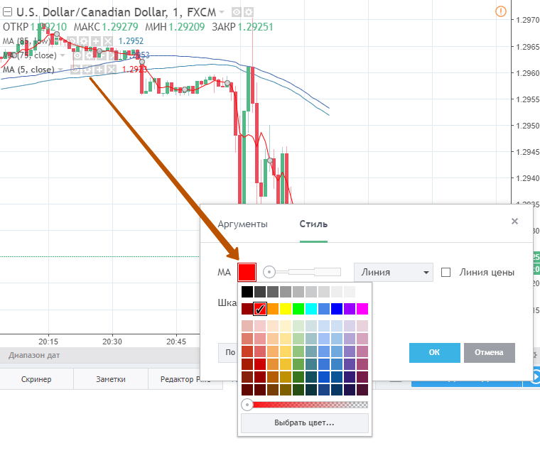 Настройка Moving Average выполняется с помощью колесика настройки, позволяющего зайти в параметры настройки, чтобы задать в них требуемые значения показателей.