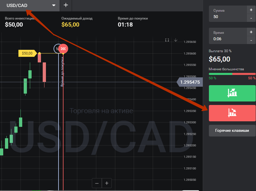 Не теряем возможность заработать на этом, ведь после сигнала стрелочного индикатора дляdigital опционов вниз мы видим, что 22 свечи закрылись зелёным цветом. Вероятнее всего, скоро последует красная свеча. Выбираем пару USD/CAD и заключаем сделку вниз со ставкой $50. Срок экспирации 5 минут на графике М5.